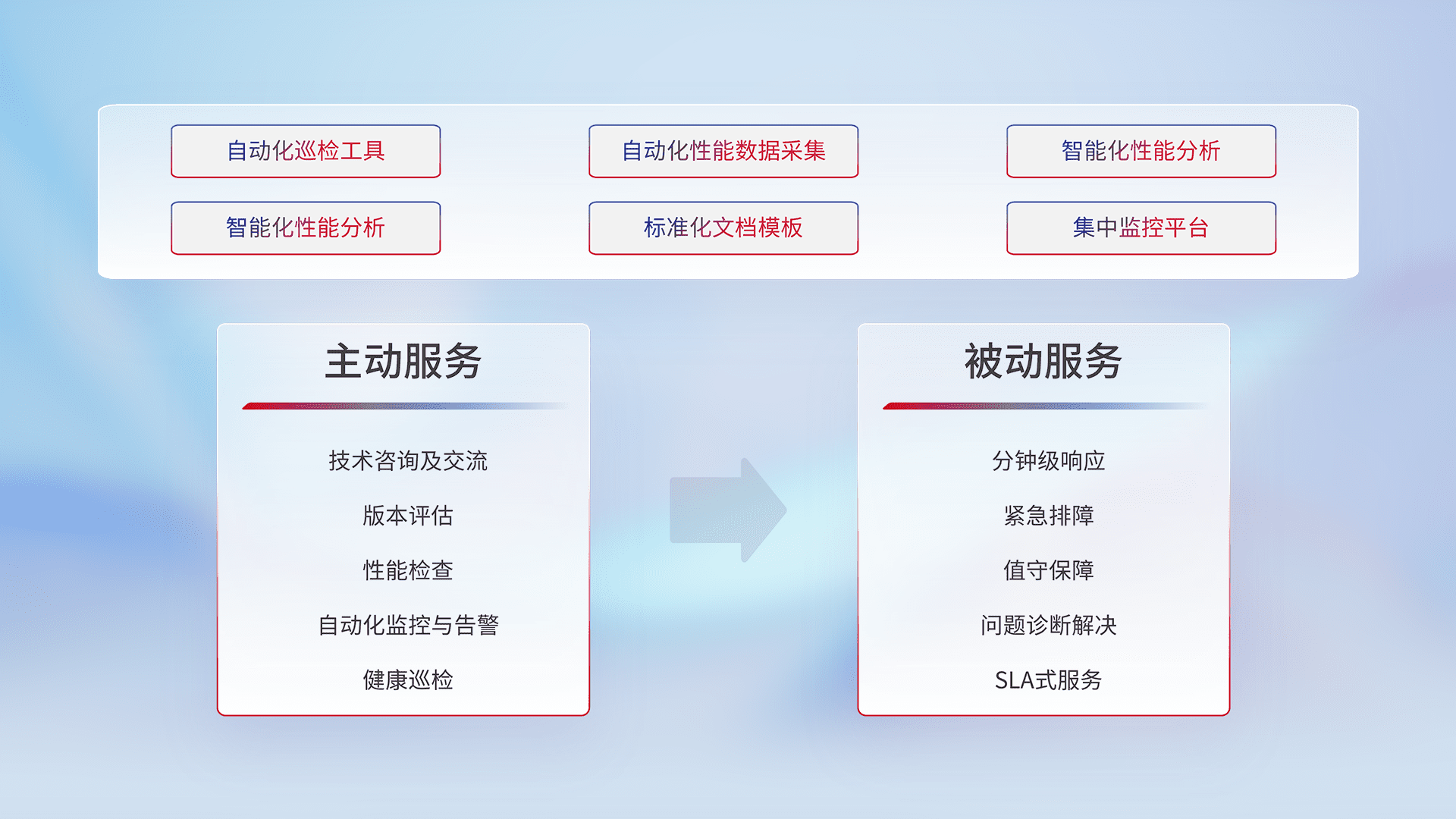 智能化工具和标准化文档,,,,保障服务质量,,提供主动服务(包含技术咨询、、版本评估、、性能检查、、、自动化监控与告警、、健康巡检)和被动服务包含(分钟级响应、、紧急排障、、、、值守保障、、问题诊断解决、、SLA服务)。。。。
